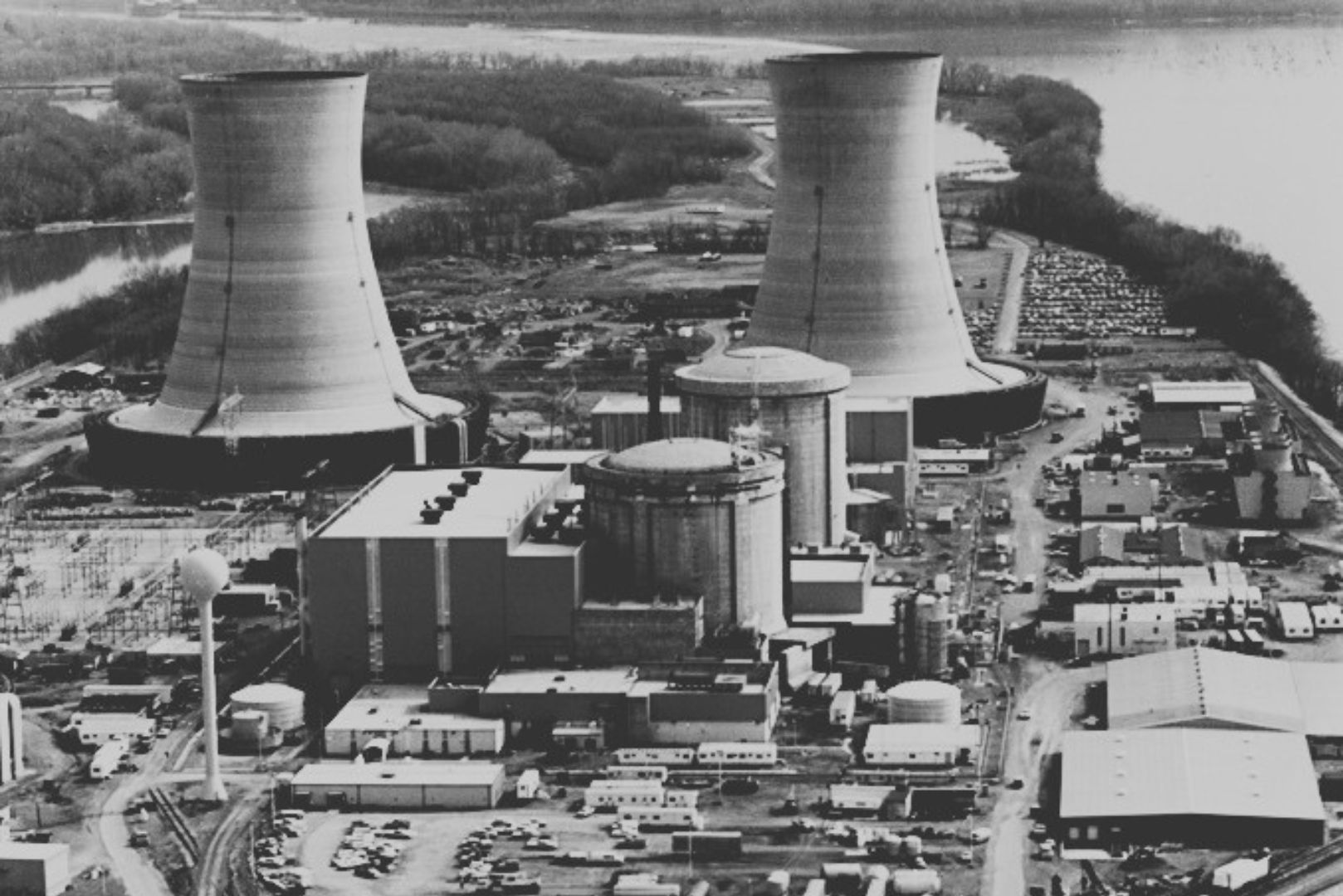 The Three Mile Island nuclear plant, Pennsylvania — Unit 2's cooling tower still stands today, a monument to the accident that reshaped American energy policy.
