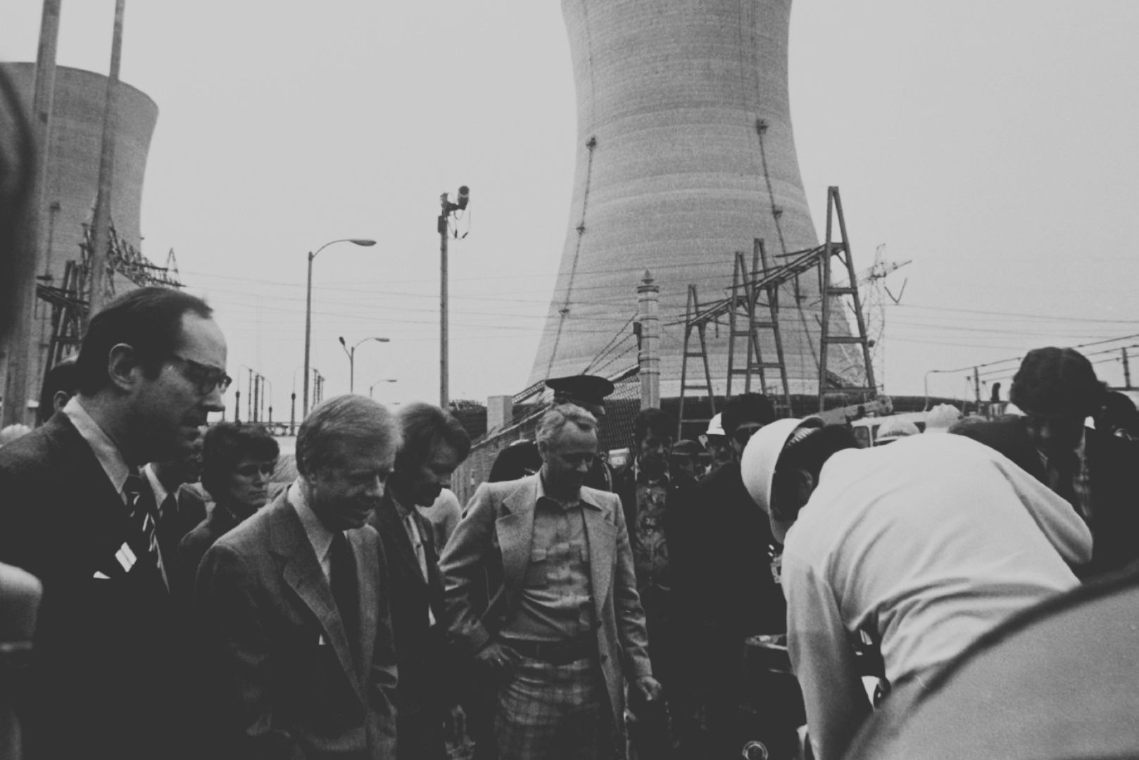 President Jimmy Carter arriving at Three Mile Island on April 1, 1979 — a trained nuclear engineer, he came personally to assess the crisis and demonstrate that it was manageable.